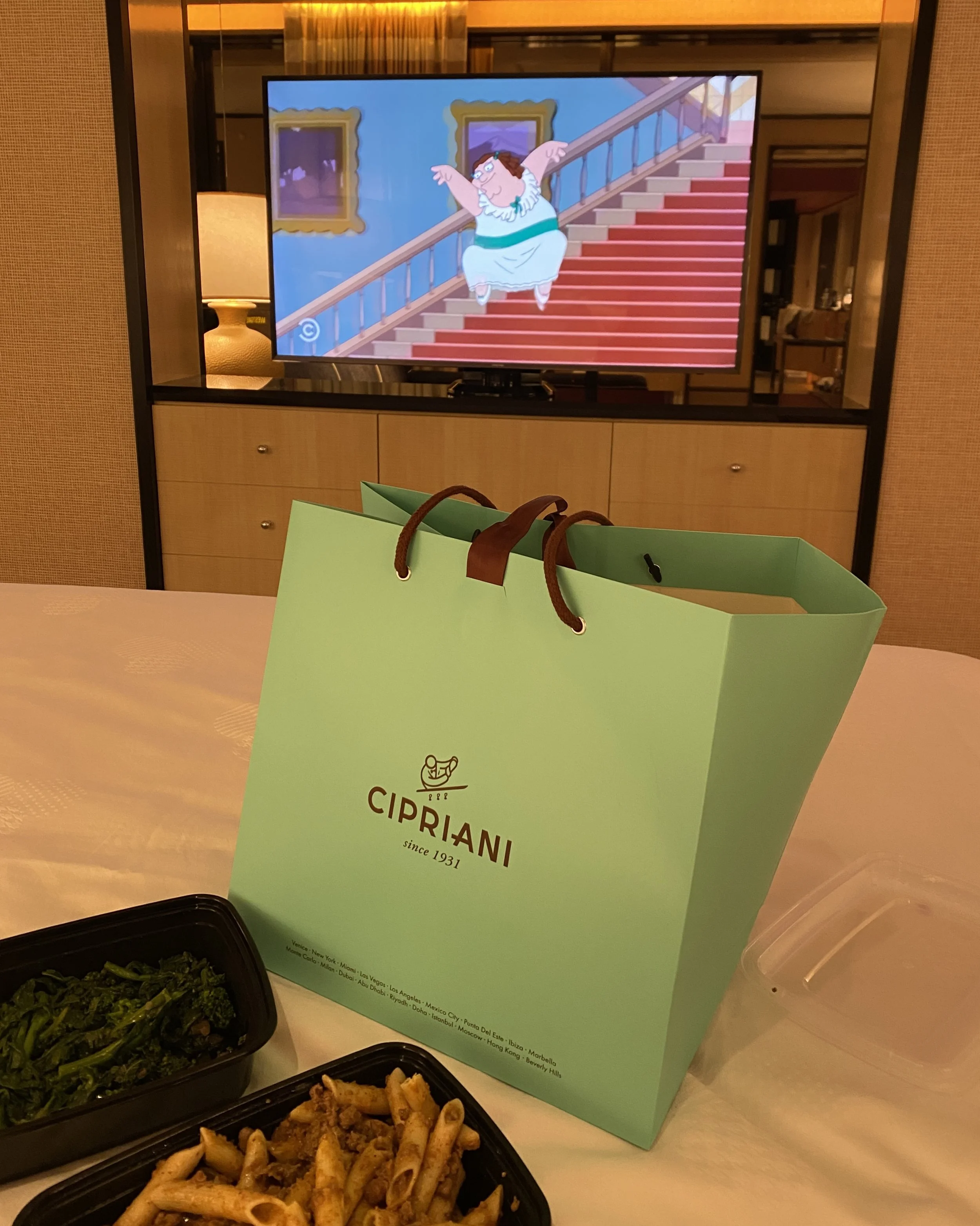 After the girly show, I bought my aching, Manolo-clad feet back to the hotel and got into my leftovers while watching Family Guy.